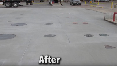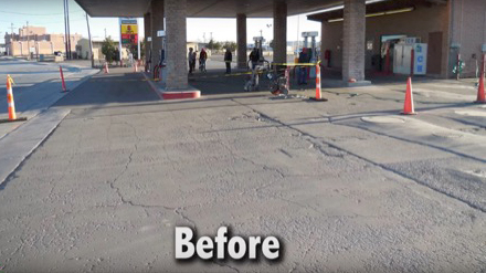 Tremendous spalling had taken place in a small gas station parking area and needed repair without disruption to service.